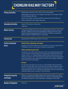 Chongjin Railway Factory is one of two major railway manufacturing facilities in North Korea's eastern corridor. Analysis of this facility can be a brick-and-mortar sign-post of foundational infrastructure progress if the trust-building project of reconnecting the Koreas' railways is carried out.