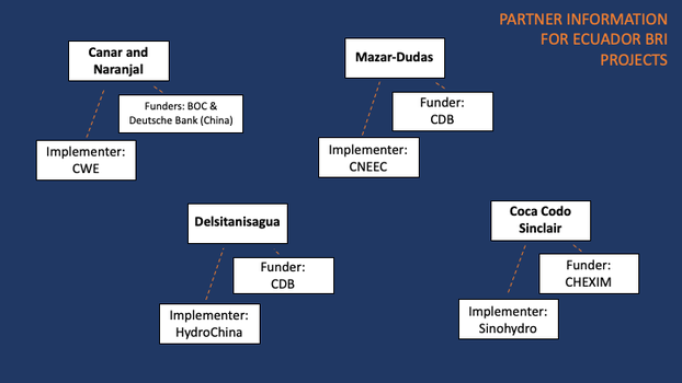 | Canar and Naranjal | Bank of China (BOC) and Deutsche Bank (China) | A Chinese state-owned commercial bank and a Chinese branch of a private company | China International Water and Electric (CWE) and the Ecuadorian state-owned company Senagua | CWE is a subsidiary company of the Chinese state-owned Three Gorges Corporation |