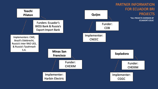 | Toachi Pilaton | Ecuador's BIESS Bank and Russia's Export-Import Bank | Both banks are state-owned by their respective countries | China International Water and Electric (CWE), Brazilian conglomerate Odebrecht, and the private Russian companies Inter RAO UES and Tyzahmash S.A. | CWE is a subsidiary company of the Chinese state-owned Three Gorges Corporation | Overseen by CELEC, a state-owned Ecuadorian company overseen by the Ministerio Energia y Recursos Naturales No Renovables |