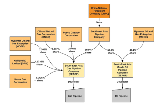 After both pipelines began operations in 2017, state-run media outlet Xinhua retroactively called both pipelines a “pioneer project of the Belt and Road Initiative.” According to the BRI Monitor, the BRI-led energy projects included in the KPSEZ oil and gas pipelines include an oil terminal, tanker port with storage facilities, offshore natural gas rigs, a natural gas terminal, and a gas-fired combined cycle power station. The oil pipeline begins at the Made Island oil terminal and tanker port, whereas the natural gas pipeline begins at the MOGE natural gas terminal and is fed from the offshore rig. The gas-fired combined cycle power station receives gas from a separate gas line and was built to satisfy the needs of Kyaukphyu as per the cooperation agreement. According to Pei Hua Yu and People's Map of Global China, an independent publication that tracks China's international activities, the CNPC owns Southeast Asia Pipeline Company (SAPC) which joined two consortiums, South-East Asia Gas Pipeline Company (SEAGP) and South-East Asia Crude Oil Pipeline Company (SEAOP), and has 50.9% ownership of both pipelines (Figure 16).