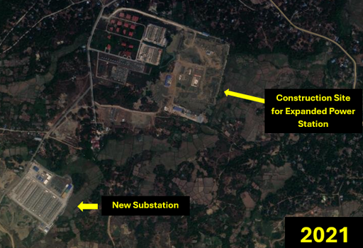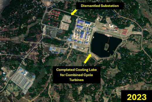 The gas-fired combined cycle power station was built by Kyaukphyu Electric Power Co. Ltd., a joint venture between SOEs Power China Resources and Myanmar's Supreme Group. According to The Irrawaddy, the station is a 135-megawatt power plant that uses Myanmar's share of natural gas to power the Kyaukphyu region. A press release from Power China Resources noted the power station began operation in October 2022, stating that Power China has "fulfilled its social responsibilities" and intends to "strengthen cooperation under the [BRI] and the [CMEC]." Imagery analysis from 2018 to 2023 showed consistent annual development of the gas-fired power station. In 2018, only the administrative buildings and dirt roads for transport were constructed (Figure 21). In 2021, farmland was cleared for development of the combined cycle turbine to power the station with a completed substation southwest of that (Figure 22). Imagery also showed development of roads for construction vehicles. In 2022, the construction site was widened considerably for the foundation of pipes that would run natural gas to the turbine (Figure 23). Imagery showed the excavation for a man-made cooling lake. In 2023, the power station was completed with the addition of water in the cooling lake (Figure 24).