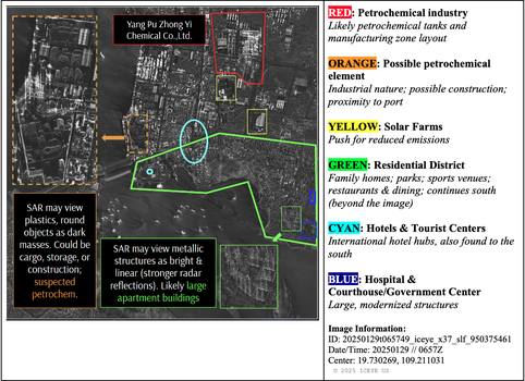 Using synthetic aperture radar (SAR) imagery from NGA's Unclassified Data Lake, we looked at a case study on the Yangpu Economic Development Zone (EDZ) in Hainan, China's largest island. We used SAR to differentiate between organic and inorganic structures, paying especially close attention to industrial-level buildings that could suggest factory or major shipment operations. To supplement SAR data from January 2025 and add granular detail and more recent information to our investigation, we employed data from Google Earth (updated May 2025).