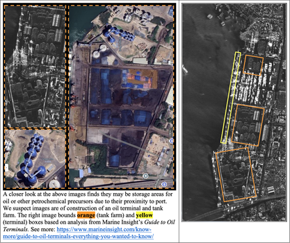 The highest-resolution image within the January 2025 collection window was selected for analysis. To support accurate imagery-based identification of petrochemical infrastructure, we also consulted industry reference materials, including Marine Insight’s Guide to Oil Terminals and other technical documentation to familiarize ourselves with common facility layouts, storage tank configurations, and related operational structures.