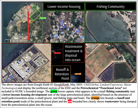 Using information from satellite imagery, we confirmed the spatial relationship illustrated in the graphic was only partially accurate: petrochemical facilities occupy a contiguous industrial zone along not only the EDZ’s north coast and inland area, but its related processes stretch down into its southernmost coastal areas. Residential, educational, and commercial zones within the eastern living area bordered many petrochemical sites, for uses including storage, industrial runoff, and shipment zones. Moreover (and discussed further below), we found evidence of residential areas even within the petrochemical functional area displayed in orange in Figure 6. The failure of imagery to support this mapping underscores the importance of highlighting areas at risk of exposure and risk in the event of a petrochemical incident.