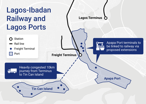 Modernization of Lagos' ports is complicated by their distance from important existing infrastructures. Lagos' second largest port, Tin Can Island, is difficult to integrate with the Apapa areas as it has no pre-existing rail capacity and is separated by a dense network of shipping infrastructure.2