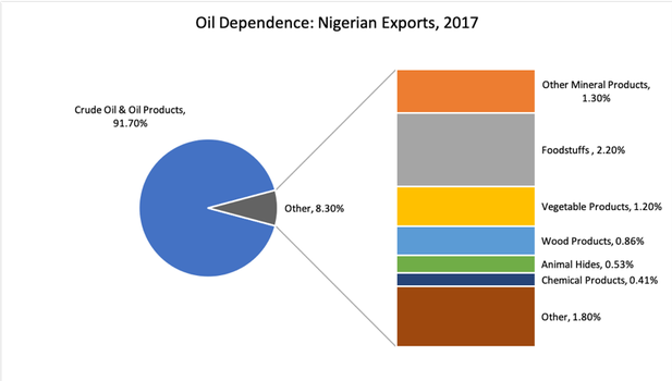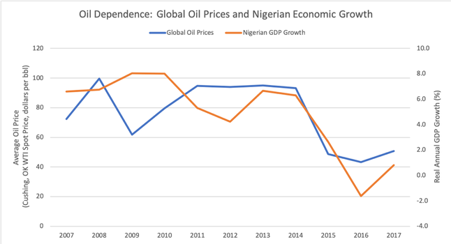Economic development in Nigeria has had ups and downs over the last decade, mostly as a result of the country's dependence on oil and commodity exports. More than 90% of Nigerian exports in 2017 and 2018 consisted of oil and petroleum products, and real GDP has declined since 2014 as oil prices have dropped (see graph 1). High hopes, promoted by Nigerian policymakers, have been placed on railway projects as a means of connecting inland areas to global markets. As part of an economic diversification agenda, the Lagos-Ibadan Railway seeks to connect the opportunity and resource rich interior to Apapa Port, the largest port in Lagos (see image 1), providing the means for diversified cargo including value added goods -- not just oil -- to pass from inland areas to global destinations.