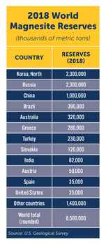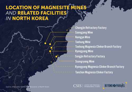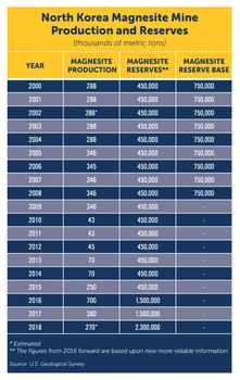 7. Kay, Amanda. What is Magnesite? Investing News Network, August 8, 2018. https://investingnews.com/daily/resource-investing/critical-metals-investing/magnesium-investing/magnesite-magnesia-mgx-minerals-globex-mining/; and Underground resources in North Korea, Magnesite, which accounts for half of the world's reserves, NK Today, March 25, 2014, http://nktoday.kr/?p=2172.