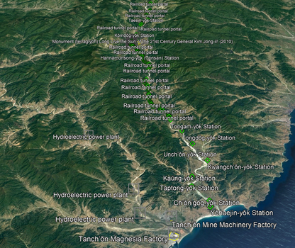 Immediately east of this valley, but still on the west bank of the Puktae-chon, is an underground mine. This mine is likely substantial as it has two portals and is served by its own narrow gauge mine rail system. One of the branch lines of this mine rail system runs through the mountain into the Kumgol-tong 1 valley where it terminates in a tailings pile. Two long-distance conveyor belt systems extend from the rail systems terminal to the east, across the Puktae-chon, to the Ryongyang Magnesia Clinker Branch Factory. Rail movements in the mine rail systems yards suggest that the mine is active but at a low level.