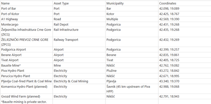 From this final list (Figure 1), we used commercial imagery and open-source data and reporting to assess the economic importance of these critical sites to Montenegro and their potential relevance to Chinese interests. This involved analyzing factors such as the volume of goods or services provided, the nature of the infrastructure, and any existing or potential connections to Chinese markets. By examining these factors, we were able to gain a more nuanced understanding of the potential impact of ownership transfers to Chinese state-owned companies on Montenegro's economy and its strategic position within the region. The reader can also fly to all the assets under study from the KMZ file in the Data Sources section. An ESRI Shapefile is also available for the primary locations.