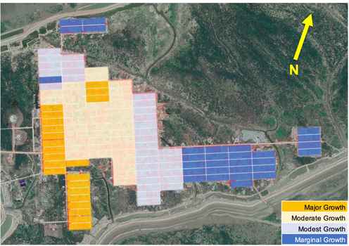 Major growth is defined as a plot experiencing 65 percent or more growth in monthly nighttime lighting at its peak in 2021 compared to its average monthly nighttime lighting in 2019. Moderate growth is defined as experiencing between 45 and 65 percent. Modest growth is defined as experiencing between 25 and 45 percent. Marginal growth is defined as experiencing less than 25 percent growth.