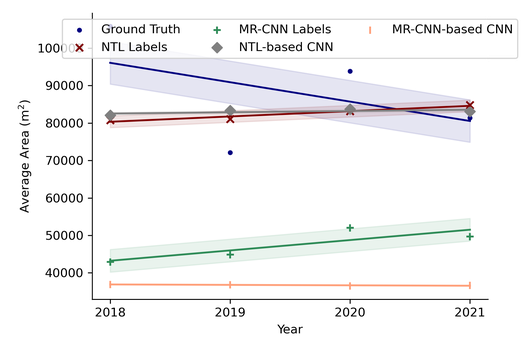 To directly compare nighttime light estimations with those of the MR-CNN-based estimations, a linear model of the form A=m*NTL+b is conceived to approximate the structured area. NTL are the predicted nighttime light values from the CNN-LSTM or raw nighttime light values, m is the slope, and b is the y-intercept. To build the linear model, values for area are obtained from 181 ground truth, geocoded images (with one site excluded due to an image being older than 2012).