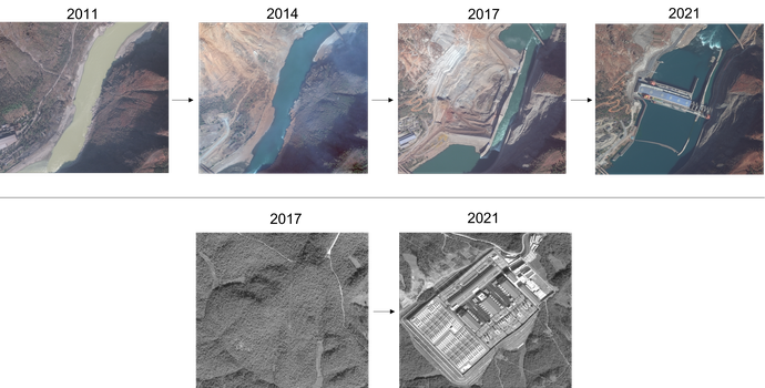 Two examples of rapid construction over a short period of time. The top row shows the development of the Jinsha hydroelectric power station in Sichuan province and one of the 103 RGB images in the 2,078 image dataset. The bottom row shows the Wudongde-Kunbei high-voltage, direct current (HVDC) static inverter plant in Yunnan province near Kunming. Images ©20[11,14,17,21], Maxar, USG Plus.