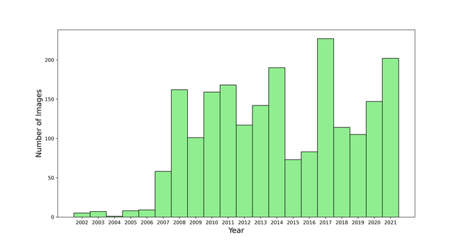 Histogram showing the number of images (y-axis) in each year listed on the x-axis. 99% of the images are from 2007 to 2021.