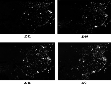 VIIRS composites covering China from 2012, 2015, 2018, and 2021. Notice the overall increase in radiance between 2012 and 2021 at this scale.