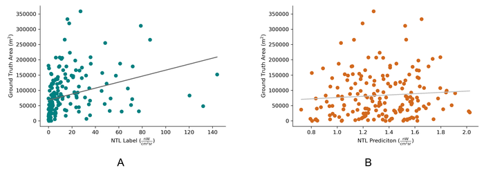 Fig. 9 shows the performance of NTL (raw labels and CNN-LSTM predictions) to approximate structural area through linear regression. The R-squared of the fit lines are 0.10 and 0.01 for Figs. 9A and B, respectively.