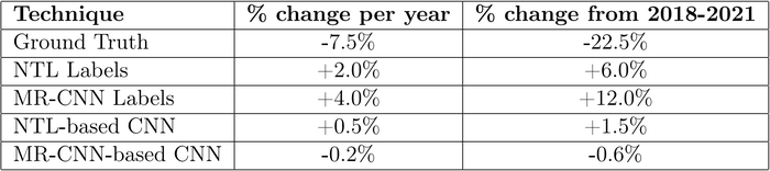 Of particular note for our application is that, across our ground truth dataset, the total amount of land that was developed decreased. This is likely reflective of highly publicized industrial greening efforts being undertaken nationwide. As we are most interested in detecting these types of trends, it is important that the algorithm used for change detection is capable of identifying the correct trend (i.e., we focus on our ability to accurately predict the trend of development, not necessarily the accuracy of any individual absolute square meterage of developed land measurement). The average trends predicted are shown in figure 4.12, by technique; of particular note is that the MR-CNN-based CNN-LSTM method is the only method that predicts the decline contained in the ground truth.