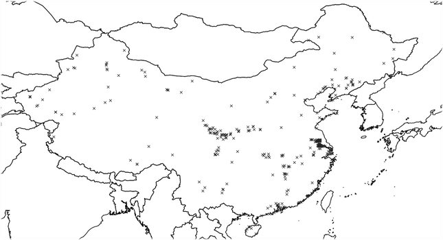 Sites of interest were selected using the GeoNames database as of September 2021, searching for "factory", "power station", and "port" within the country of China to filter results. This resulted in a sample of 419 industrial sites, encompassing 215 factories, 148 power stations (hydroelectric dams, coal plants, converter stations, etc.), and 56 ports. As seen in Fig. 2, the sites cover a diverse geographic range throughout China's mainland borders. For each of these locations, image scenes were retrieved from G-EGD, owned and operated by Maxar Technologies. Image tiles were selected from Maxar imagery based on the oldest archived strip available, spacing instances evenly to the newest strip, limiting cloud cover, and minimizing nadir. Images were then cropped from the tiles based on a 800x800 meter (64,000 square meter) geographic square centered around the location's coordinates.