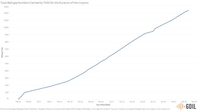 The United Nations High Commissioner for Refugees reports that around 728,000 refugees have transited into Russia. This number is in conflict with TASS's article from May 4th, which claims that over 1. 1 million refugees have crossed into Russia. TASS even reports UNHCR's number, only to reassert that there are 1.2 million refugees in a subsequent article.May 04, 2022