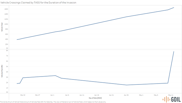 Traffic volumes of commercial and civilian vehicles represent a proxy for indications of refugee flows out of Ukraine. Since the beginning of the war, most Russia-Ukraine border checkpoints have not seen a substantial increase in refugee inflows or traffic compared to border checkpoints in Western Ukraine. An accurate picture of the numbers of refugees can help other countries, NGOs, and relief organizations prioritize resources and areas where refugees are truly located.