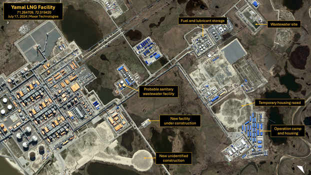 As seen in the latest accessible cloud-free high-resolution satellite imagery from Maxar taken on July 14, 2024, the Yamal LNG facility is supported by Sabetta port and a marine offloading facility to the east, Sabetta International Airport approximately five kilometers to the southwest, and a number of open-air storage yards and support facilities such as worker housing surround the facility.