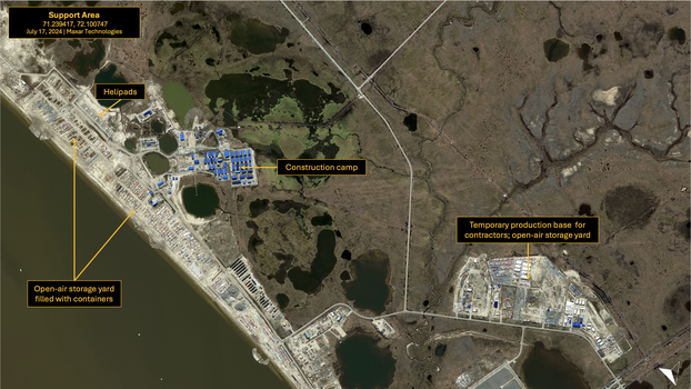 Further southeast of the Yamal LNG facility in July 2024 is the support area, serving as an open-air storage yard filled with containers and materials, six helipads, construction camp, and temporary production base for contractors. Three helicopters were observed on helipads.