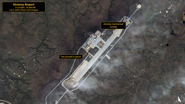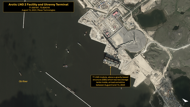 The latest accessible cloud-free high-resolution multispectral image from Maxar taken on July 4, 2024, shows the Arctic LNG 2 facility is supported by Utrenny Airport, approximately 15 kilometers to the east, and the Utrenny Terminal, where the GBS are located. Additionally, a number of open-air storage yards and support facilities such as worker housing surround the facility.