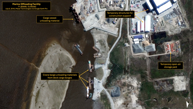 The construction process at the facility is better observed in the next available feasible high-resolution Maxar image, taken two years later, on July 6, 2016. Given the harsh Arctic conditions, the speed of the construction is notable and indicates the high priority of the development of the Yamal LNG facility. Because the Arctic’s permafrost makes construction challenging, 122 modules for the Yamal LNG facility had been fabricated and shipped by 10 different yards from China and Indonesia.Stéphane Le Galles and Michael Borrell, Yamal LNG: Delivering World-Class LNG Project, Investor Day Presentation, TotalEnergies, 2017, https://www.totalenergies.com/media/document/yamal-lng-overview. Modules were fabricated from shipyards in China (Tianjin, Penglai, Qingdao, Zhangjiagang, Qidong) and Indonesia (Batam).[10]