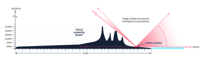 But the Sopka-2 on Wrangel Island is a 3D dual-use S-band air-route radar with a range of 350km. It faces east in an arc stretching from the Beaufort Sea in the north to the Bering Strait in the south, but its 350km maximum range means that its coverage does not extend into either. Additionally, the location of the Sopka-2 is below the peaks of the islands Gora Sovetskaya mountain to the west and northwest, which results in some terrain masking to avoid potential low- and medium-altitude threats from that direction. The significance of this limitation is unclear as the area to the west may be covered by other radar systems.2
