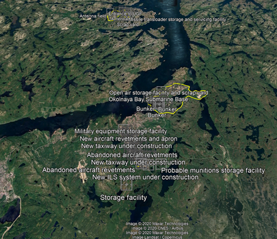 Severomorsk-1 Air base in relation to Okolnaya Submarine Support Base and Gadzhiyevo Submarine Base. Gadzhiyevo (top) Okolnaya (middle) Severomorsk (bottom)