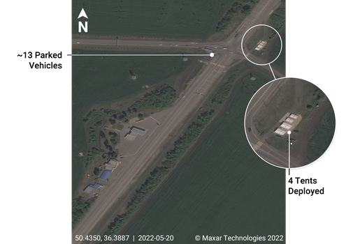 Through imagery and open media analysis, we located a possible filtration site along the M-2 Highway in the Belgorod Oblast, between the Ukrainian town of Kharkiv and the Russian town of Belgorod. Imagery analysis included tent encampments and vehicle activity similar to what was observed at the identified filtration camps in the Donetsk Oblast. In July 2022, a Russian official reported the relocation of a mobile “TAC” to a spot 8 km from the Nekhoteevka checkpoint on the Ukraine-Russia border in Belgorod Oblast, Russia. The alleged M-2 Highway filtration site is located generally in that vicinity, approximately 12 km from Nekhoteevka. Between April 26, 2019 (pre-invasion) and May 20, 2022, imagery analysis suggested a deployment of tents by May 2022 (see Figures 12 and 13). Although the Russian official referred to the site as a TAC, filtration was probably performed at this location because it would be the first tent encampment encountered on a major highway leading out of the city of Kharkiv, which saw intense fighting up until May 2022. The situation is comparable to the Manhush, Bezimenne, and the Veselo-Voznesenka filtration sites, which are also located on major highways leading out of intense fighting in Mariupol. Furthermore, open-source reporting mentioned the existence of a filtration site between Kharkiv and Belgorod where civilians endured “fingerprinting… and an interrogation with a ‘psychologist’.” Due to the identification of several key filtration site indicators and corroborating open-source reporting, we assess with high confidence that the M-2 Highway location was a filtration site.