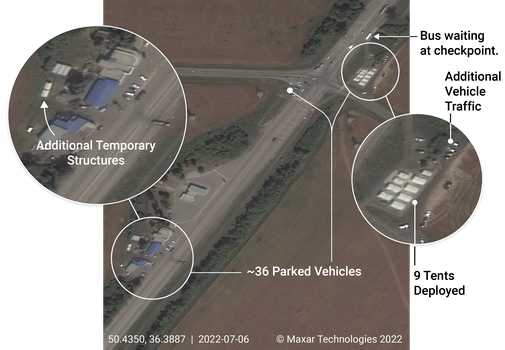 The Conflict Observatory report’s filtration identification methodology aided GDIL in setting key indicators for filtration activity (e.g., location and proximity to major areas of conflict, use of tents and/or expansion of infrastructure, vehicle queues, high volumes of parked passenger vehicles and high-capacity vehicles, and human queues). In addition, GDIL gleaned a baseline understanding of the levels of vehicle and pedestrian activity expected at a filtration site. To identify new sites, GDIL explored areas outside Donetsk that were not previously reported, searched for the key indicators in imagery, and sought to corroborate possible filtration operations with open-source reporting. As a result, GDIL identified six new potential filtration sites at or near checkpoints into Russia or Russian-occupied Ukraine, monitored the site activity over time, and evaluated how regional filtration activity trends related to anticipated, active, or settled conflict areas. The ten sites include the following locations: