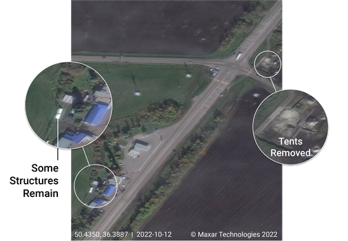 The Kremlin likely anticipated a flux of displaced civilians from the fighting in Kharkiv between February and May 2022 and deployed the filtration site to process Ukrainians (see Graphic A), but dismantled the site due to a reduction in civilian traffic or an underwhelming turnout at the site in late Summer 2022. Despite the continued Ukrainian counteroffensives between September and October 2022 in the Kharkiv Oblast region, commercial imagery analysis between August 9 and October 12, 2022, suggested that the Russians did not reconstruct the alleged filtration tents or “mobile TACs” at the location, which would have been well positioned to process Ukrainian civilians fleeing the resurging conflict. As of October 12, 2022, only two temporary structures adjacent to the gas station were still present (see Figure 16). We assess that the Ukrainian advancement north of the city of Kharkiv in September 2022 likely slowed an already low civilian migration to Belgorod, Russia. When the area north of Kharkiv was under Russian control in early September, the Russian authorities likely urged civilians to flee to Russia. As Ukraine retook territory in Kharkiv, this likely eliminated Russian authorities’ influence on civilian migration to Belgorod. Thus, the Kremlin likely did not expect significant civilian flows to Belgorod through the M-2 Highway site; and therefore, did not reconstitute the filtration infrastructure at the location.