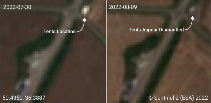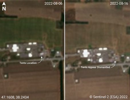 According to GDIL imagery analysis, the number of tents and parked vehicles more than doubled from May 20, 2022, to July 6, 2022. In that time frame, the number of tents increased from four to nine, and the number of parked vehicles from approximately 13 to 36 (see Figures 13 and 14). In July 2022, we also observed a white bus at the driveway into the tent encampment (see Figure 14). Although we observed increases in vehicle activity, the overall numbers are relatively low compared to the vehicle traffic observed at filtration sites in southern Donetsk and at the Veselo-Voznesenka checkpoint. These sites experienced numbers ranging from approximately 60 to 150 queued and parked vehicles and high-capacity vehicles at peak activity, compared to the M-2 Highway site’s peak volume of approximately 37 vehicles on July 6, 2022. Between July 30 and August 9, 2022, authorities dismantled the northern collection of tents according to imagery from the Sentinel-2A satellite (see Figure 15). In that same period, a Russian regional official described a “slight decrease [of those staying from Ukraine]” at the site and stated that they would remove the mobile site once it was “no longer needed.”
