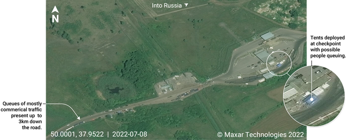 The Logachevka border crossing checkpoint, located between Kharkiv Oblast, Ukraine, and Belgorod Oblast, Russia, is a possible site where Moscow is using tent deployments combined with existing infrastructure to conduct filtration operations. Between August 6, 2020 (pre-invasion) and September 9, 2022, imagery analysis of the Logachevka site suggested the presence of three key indicators for filtration operations: 1) the deployment of tents at the checkpoint, 2) extensive vehicle queues, and 3) human queuing at tent structures. On April 9, 2022, we first observed the tent deployment at the checkpoint and a 3.1 km long passenger vehicle queue attempting to enter Russia (see Figure 18). On July 8, 2022, although the extensive vehicle queue primarily consisted of commercial trucks, we identified a potential area of human queuing at the blue tent (see Figure 19). On September 9, 2022, we measured a vehicle queue approximately 2.5 km in length and continued to observe the presence of the tent cluster (see Figure 20). We cropped the images in Figures 18 through 20 to fit them in the report; therefore, the entire vehicle queues were not included. We lacked open-source reporting to directly support our assessment of filtration activities at the Logachevka checkpoint, but there had been general statements by Ukrainian media of Russian soldiers interrogating Ukrainians in Belgorod. Based on the three identified key indicators for filtration activity at the site, paired with limited open-source reporting, we assess with low to medium confidence that the Logachevka checkpoint was used for filtration.