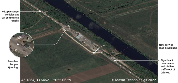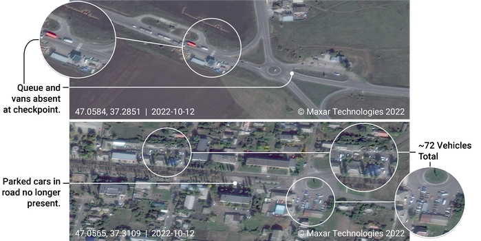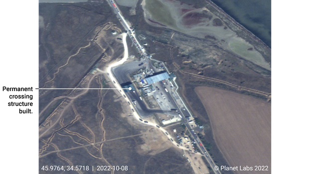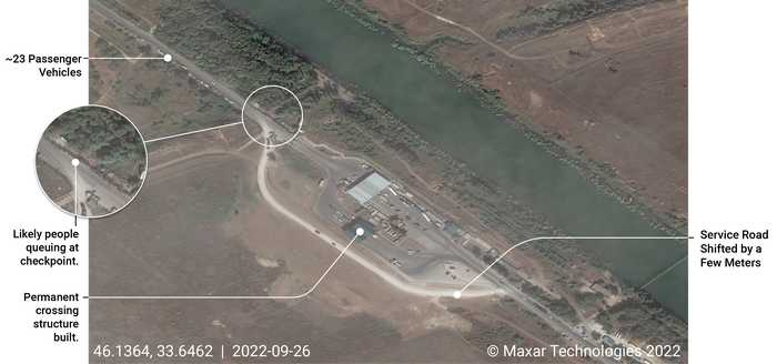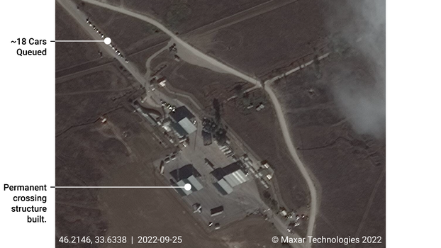 Imagery analysis between April 29, 2022 and September 26, 2022 showed queues that ranged from 23 to 120 passenger vehicles, averaging approximately 62 passenger vehicles awaiting entry into Crimea. With the Ukrainian southern counteroffensive approaching the town of Kherson in late August 2022, we assess with moderate confidence that Russian authorities constructed the new permanent structure, as opposed to deploying tents, to accommodate the existing and expected high volumes of queued vehicles and the long wait times due to the filtration operations. We also assess that the expanded service road was likely constructed for civilians or military personnel with the appropriate credentials and/or documentation to bypass the filtration activities occurring under the permanent structures. As anticipated, between September 26 and October 20, 2022, we observed an increase in the number of vehicles in queue from approximately 23 to 61 passenger vehicles awaiting entry through the checkpoint. This increasing activity likely aligned with the urgency to move civilians out of Kherson due to the tense military situation and the advancement of Ukrainian forces in late October 2022. Between October 20 and 29, 2022, we noticed a substantial shift in the vehicle queues, with vehicles lining up to re-enter Ukraine and a few vehicles, primarily commercial trucks, awaiting to enter Crimea.