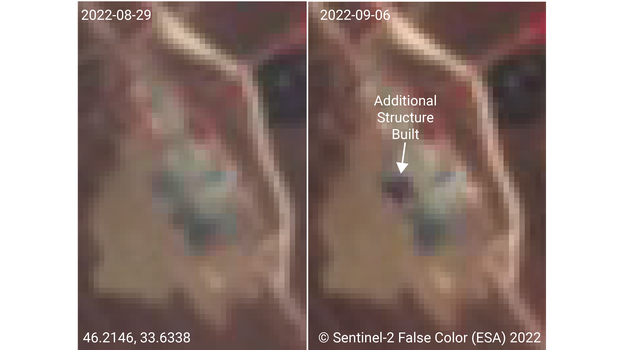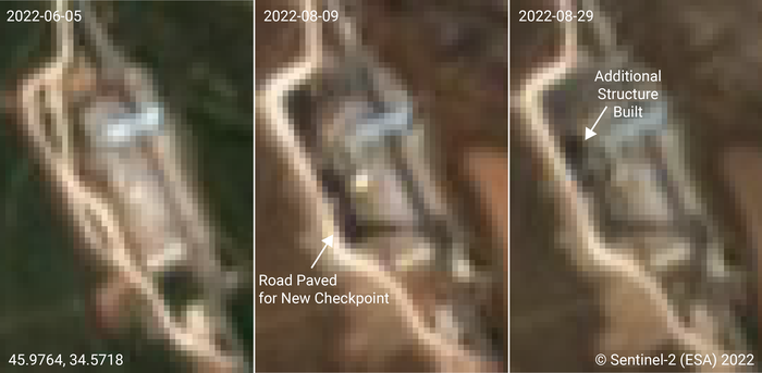 As previously discussed and similar to the Armyansk location, we identified the Perekop border checkpoint, located on the Crimean Peninsula between Kherson Oblast and Crimea, as a site with possible filtration activity. Between May 5, 2021 (pre-invasion) and May 25, 2022, imagery analysis revealed an increase in activity from little to no visible vehicle or human queues at the Perekop checkpoint before the war to a queue of approximately 40 passenger vehicles (see Figure 24). Compared to the Armyansk checkpoint, we observed similar construction of new permanent infrastructure and vehicular queues at the Perekop border crossing in the same time frame. Between August 29 and September 6, 2022, analysis of Sentinel 2-A imagery showed the construction of a new processing station similar to the one observed at Armyansk (see Figure 25). Due to the identification of several key filtration site indicators, including proximity to the Ukrainian southern counteroffensive in Kherson Oblast, the presence of extensive vehicle queues, and the expansion of infrastructure, as well as a corroborating open-source report describing filtration activities at Crimean checkpoints, we assess with moderate confidence that there were filtration operations at this location.