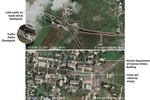 At the police checkpoint, imagery analysis from August 30, 2021 (pre-invasion) to April 3, 2022, suggested a significant increase in vehicle activity, which likely reflected the civilian migration spurred by the fighting in the nearby city of Mariupol in the spring of 2022. In August 2021, there was little traffic passing through the checkpoint (see Figure 2). In April 2022, we identified approximately 20 white vans parked inside the checkpoint and 76 vehicles queued at the checkpoint headed west (see Figure 3). Between April 3 and May 8, 2022, we first noticed a decline in vehicles, with approximately 13 parked vans inside the checkpoint and 27 vehicles headed in both directions on May 8, 2022 (see Figure 4). In addition, the extensive vehicle queue, observed in April 2022 heading toward Ukraine, was not present. Between May 8 and October 12, 2022, we observed a further reduction in vehicle traffic, with the absence of the vans and the vehicle queue and only some commercial vehicles heading in both directions on October 12, 2022 (see Figure 5).