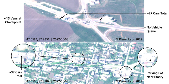 Using testimonies and video media, the Conflict Observatory identified two filtration sites in the town of Manhush, located in the southern Donetsk Oblast region: 1) A police checkpoint and 2) the Manhush District Department of Internal Affairs (2 km east of the police checkpoint). GDIL is contributing imagery analysis of both sites to evaluate the changes in site filtration activity over time. Since both sites used permanent structures for filtration operations, we used levels of vehicle activity as a proxy for the level of filtration site activity. GDIL observed an overall decline in vehicle activity at the two locations, which started between April and May 2022 and continued into October 2022.