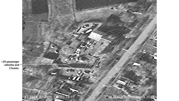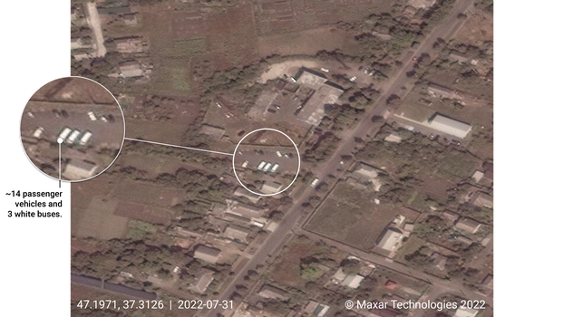 The Conflict Observatory used open sources and imagery analysis to identify the Nikolske Police Department as a filtration site. In their report, they provided imagery from March 19 and April 3, 2022, to demonstrate the increasing volume of vehicle activity at the site between the two months. GDIL estimated vehicle counts from the April 3, 2022 imagery, which were not included in the earlier Conflict Observatory reporting, analyzed new imagery from July 31 and November 15, 2022, and assessed an overall declining trend in vehicle traffic between April and July 2022. We estimated approximately 54 passenger vehicles and seven white buses in the areas around the Police Department on April 3, 2022. According to imagery acquired by GDIL, this was followed by decreases in traffic on July 31, 2022 (see Figure 6) and November 15, 2022, with approximately 25 vehicles and two buses in the same areas (see Figure 7).