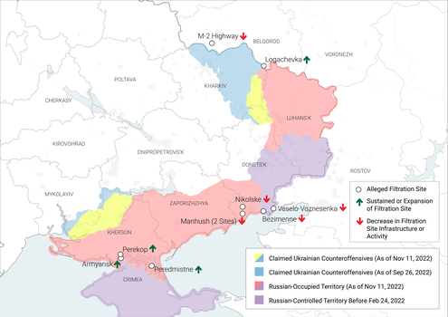 Russia appears to expand filtration site infrastructure in areas where they expect intense conflict will spur flows of displaced civilians. As the Russian forces prepare to battle future Ukrainian counteroffensives in Russian-controlled territories, signs of Moscow's investment in certain filtration sites can provide insight into the Kremlin's anticipated areas of fierce conflict, and the resulting influx of Ukrainian civilians.