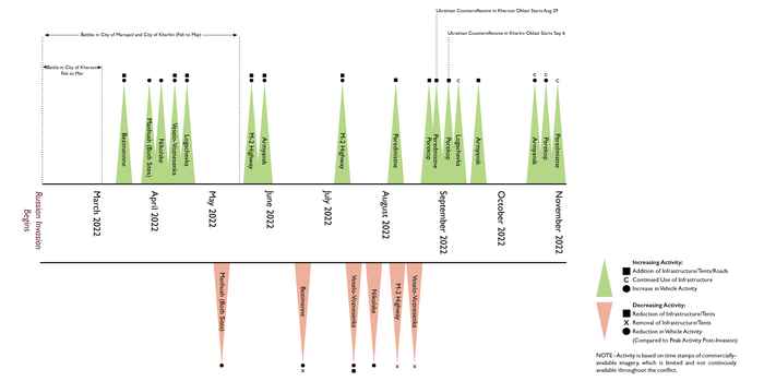 The Russians may have expanded their filtration operations with the construction of new permanent structures in September 2022 due to the anticipated fighting in Kherson Oblast, where the Ukrainians launched a southern counteroffensive in August 2022 and continued to advance as of early November 2022 towards the Russian-controlled city of Kherson (see Graphic A). At the time, Russian authorities likely anticipated an influx of displaced civilians and an increasing need for filtration operations at the Crimean checkpoints due to the fighting.
