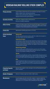 Wonsan Railway Rolling Stock Complex is the largest manufacturing and repair facility for railcars in the nation. Analysis of this facility can be a brick-and-mortar signpost of foundational infrastructure progress if rapprochement leads to new opportunities for infrastructure development.