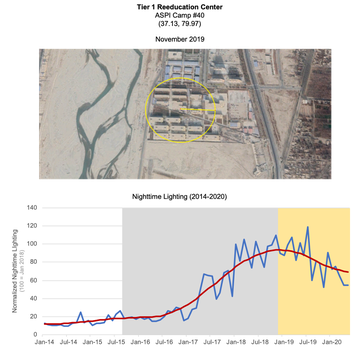 In the bottom panel of Figure Two, the average monthly nighttime lighting of this facility is shown for each month from January 2014 through May 2020 (the last month in which data is available), shown in blue. These values are normalized to the level of nighttime lighting seen over this facility in January 2018, in order to better assess relative changes over time. This approach allows us to easily assess the magnitude of changes in nighttime lighting over time at this facility. For example, nighttime lighting over this reeducation center in January 2016 was roughly 80 percent lower than in January 2018.