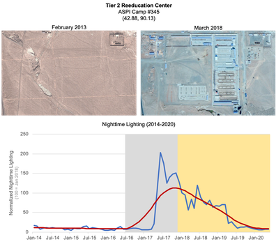 GEOINT analysis of nighttime lighting and satellite imagery data over known detention and reeducation facilities in Xinjiang reveals the explosive growth of these facilities over time, and reveals a coordinated campaign beginning in 2016 to construct the vast majority of Xinjiang's detention facilities over a multi-year period through mid-2019.