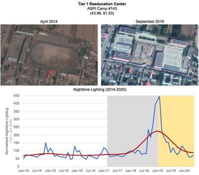 Overall then, we assess that major spikes in nighttime lighting represent evidence of construction at known detention facilities. In some cases, this growth represents construction of new facilities from scratch, or even new buildings on facilities as they expand over time. In other cases, it represents construction activity to repurpose existing facilities to serve as detention camps. Either way, nighttime lighting serves as a useful metric to capture both the timeliness and magnitude of growth in Xinjiang's broader detention system.
