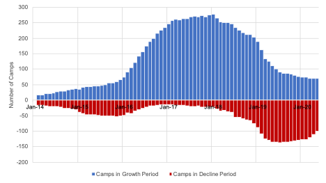 After analyzing the nighttime lighting trends of all 380 detention facilities in our dataset, we can ultimately assess the extent to which major periods of construction occurred across the broader Xinjiang detention system. Figure Five below plots the number of detention facilities in our dataset experiencing a major period of growth in nighttime lighting for each month since January 2014. We include those facilities experiencing a major decline as well, for reference. In a given month on this figure, each bar represents the number of distinct detention facilities experiencing an uninterrupted period of growth (blue) or decline (red) in smoothed nighttime lighting.