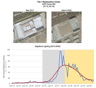At face value, this correlates with official Chinese government claims to have ceased or relaxed its detention measures around this same period of time. But does a decline in nighttime lighting actually imply that these facilities have been closed and decommissioned? Or, does it simply suggest a reversion to ordinary levels of nighttime lighting for active facilities no longer under construction?