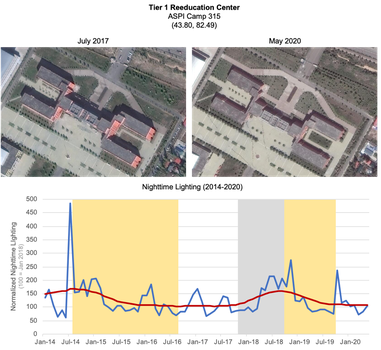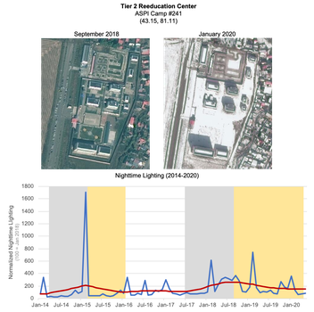 This research analyzes monthly nighttime lighting data over known detention facilities in Xinjiang, based off a dataset of 380 known or suspected facilities originally identified by ASPI. Using the locations of these facilities, we measure the average nighttime lighting over each facility on a monthly basis from 2014 through mid-2020, and identify major periods of uninterrupted growth or decline in nighttime lighting over time. Further details on this portion of our analysis are included in the first report in this series.