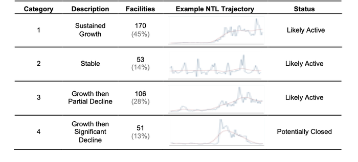 Table One below summarizes the results of this classification process, showing the number of facilities in our dataset associated with each growth trajectory, along with the nighttime lighting trajectory of an example facility in each category.