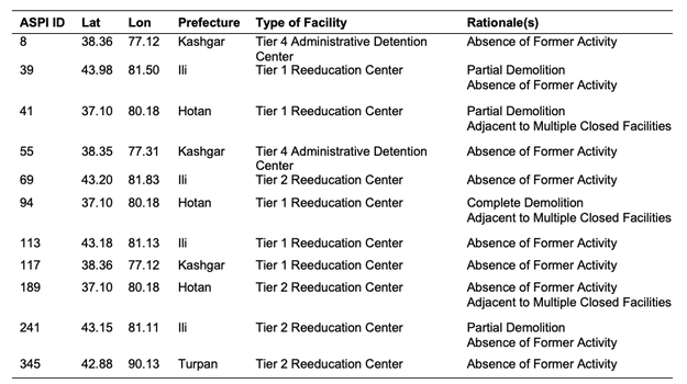 Table Two. Xinjiang Detention Facilities with Evidence of Likely Closure